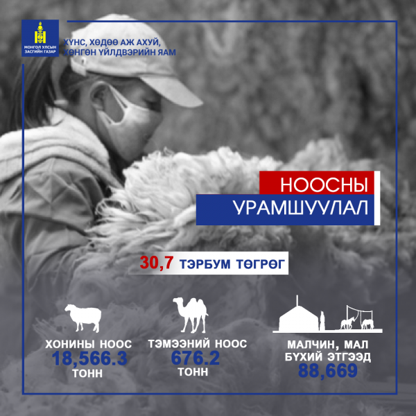 Үндэсний 83 үйлдвэр, цехэд 2020 онд хонь, тэмээний ноос бэлтгэн нийлүүлсэн 90,064 малчин, мал бүхий этгээдэд 31.2 тэрбум төгрөгийн мөнгөн урамшууллын баримт бүртгэгдсэн. Үүнээс журмын шаардлага хангасан 78 үйлдвэрт 18,566.3 тонн хонины ноос, 676.2 тонн тэмээний ноос бэлтгэн нийлүүлсэн 88,669 малчин, мал бүхий этгээдэд 30.7 тэрбум төгрөгийн мөнгөн урамшууллыг малчдын дансанд шилжүүлээд байна.