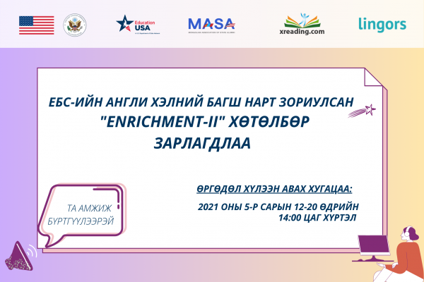 АНУ-ын Элчин сайдын яам, Монгол дахь Америкт Төгсөгчдийн Холбоо (MASA), EducationUSA Mongolia хөтөлбөр, Лингорс, Xreading цахим номын сангийн Монгол дахь төлөөлөгч байгууллага хамтран улсын болон хувийн бүх Ерөнхий боловсролын сургуулийн Англи хэлний багш нарт зориулан “ENRICHMENT-2021” хөтөлбөрийг зарлаж байна.