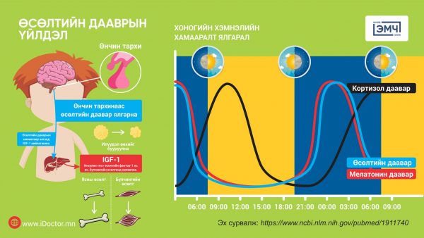 Өнчин тархины өмнөд хэсгээс нийлэгждэг өсөлтийн дааврын (соматотропин) ялгаралтанд хоногийн биохэмнэл чухал нөлөөтэй. Шөнийн 21-22 цагийн үеэс эхэлж нойрыг зохицуулдаг мелатонин даавар ялгардаг байна.