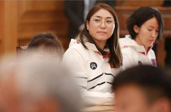 Мөн алтан соёмбот төрийн далбаагаа өндөрт өргөж, олимпийн медальтан олноор төрүүлэхийн ерөөл дэвшүүлээд Үндэсний шигшээ багийн ерөнхий дасгалжуулагч, хөдөлмөрийн баатар, ардын багш Ч.Насантогтоход төрийн далбаа гардууллаа.