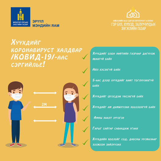 Манай улсад одоогийн байдлаар коронавируст “Ковид-19” халдвараар өвчилж буй гурван хүн тутмын 1 нь хүүхэд байна. Цаашид хүүхдийн өвчлөл нэмэгдэх хандлагатай байгаа тул дараах зөвлөмжийг өгч байна.