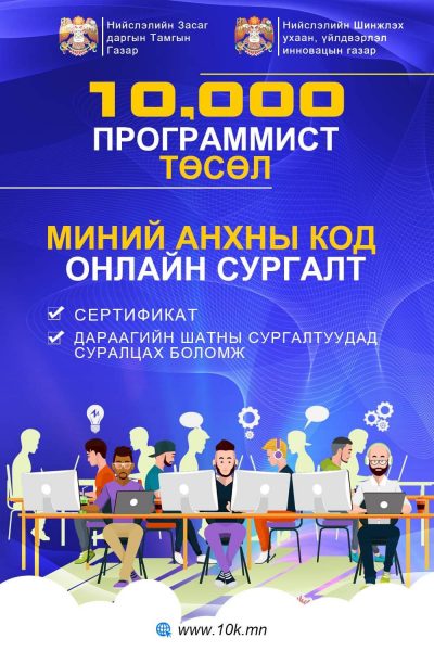 НШУҮИГ-аас “10000 программист” төслийг хэрэгжүүлэх хүрээнд “Миний анхны код” сэдэвт хүүхэд залууст зориулсан код бичих анхан шатны суурь мэдлэгийг олгох онлайн сургалтыг www.10k.mn платформоор дамжуулан зохион байгуулж байна.