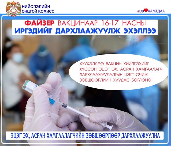Эрүүл мэндийн сайдын тушаалаар өнөөдрөөс эхлэн 16-17 насны хүүхдүүдийг дархлаажуулалтад хамруулж эхэллээ. Дархлаажуулалтад хамрагдах хүүхдүүдэд Файзер вакцин хийх юм. Ингэхдээ тухайн хүүхдийн эцэг эх, асран хамгаалагчийн зөвшөөрлөөр, сайн дурын үндсэн дээр вакцинжуулалтад хамруулна.