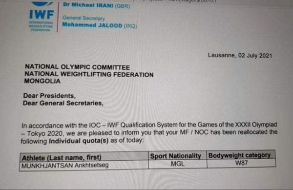 Олон улсын хүндийн өргөлтийн холбооноос Монголын хүндийн өргөлтийн холбоонд захидал илгээн, албан ёсоор мэдэгдэв.