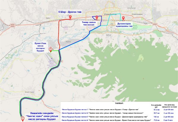 Мөн “Чингис хаан” олон улсын нисэх онгоцны буудал–Төмөр замын төв вокзал” чиглэлийн үйлчилгээтэй холбогдуулан Төмөр замын төв вокзалын баруун талын 1000 машины зогсоолын талбайд шинээр автобусны зогсоол байгуулж, иргэдийн хөдөлгөөний аюулгүй байдлыг ханган ажиллаж байна. Үйлчилгээний цагийн хуваарийг нислэгийн цагийн хуваарьтай уялдуулан боловсруулсан бөгөөд нислэгийн цагаас 3-4 цагийн өмнө Улаанбаатараас хөдөлнө. Нэг талдаа 80-100 минут зарцуулна гэж тооцоолж, зорчилтоо төлөвлөн үйлчлүүлэх боломжтой. Түүнчлэн энгийн болон VIP 60 такси үйлчилгээнд явах бэлтгэл ажлыг хангаад байна.