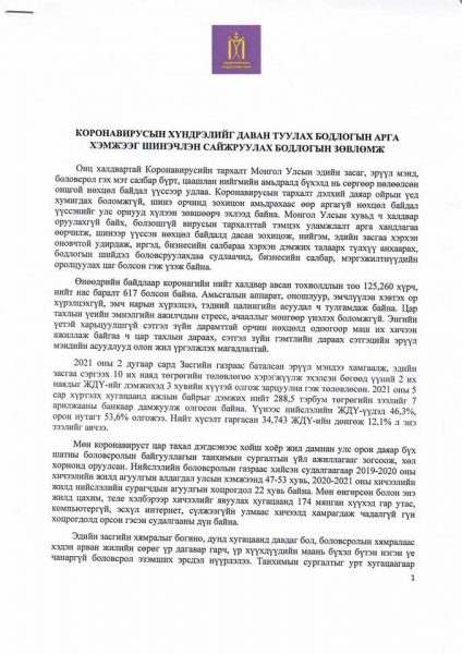 Монгол Улсад үйл ажиллагаа явуулдаг мэргэжлийн холбоод, үйлдвэрчний эвлэл, судалгааны байгууллагатай хамтран дээрх зөвлөмжийг боловсруулсан. Судалгаанд суурилсан шийдвэрийг ажил хэрэг болгодог байя. Үндсэндээ 1.5 жилийн хугацаанд цар тахалд ялагдчихлаа. Дэлхийн сайн жишиг болон судлаач мэргэжилтнүүдийн үгийг сонсч байж Засгийн газар ажилладаг байя. Энэ үүднээс зөвлөмжийг Ерөнхий сайдад өгч байна. Хэрвээ зөвлөмжид тусгагдсан арга хэмжээ авахгүй бол бид хариуцлага тооцох асуудлыг намрын чуулган дээр ярихыг албан ёсоор мэдэгдэж байна. Эдийн засагч хүний хувьд хүндрэлтэй нөхцөлд бусад салбарт үр ашиггүй хийгдсэн хөрөнгө оруулалт, хөшөө дурсгал гэх мэт арга хэмжээнээс татгалзъя. Барилгын салбарын түүхий эд, арматурын үнэ хоёр дахин өсчихлөө. Хилийн боомтод гацаа үүслээ.