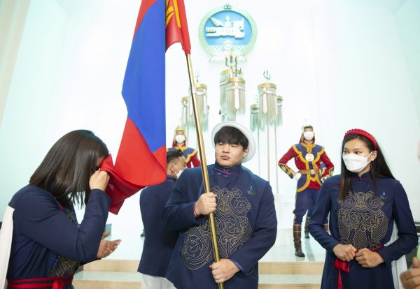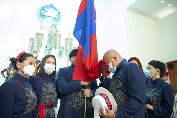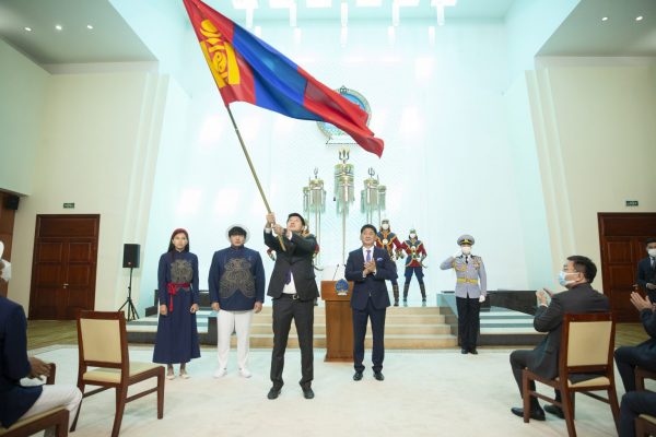 Баг, тамирчдад амжилт хүсэх ёслолын ажиллагааны үеэр Монгол Улсын Ерөнхийлөгч У.Хүрэлсүх Монгол Улсын Төрийн далбааг олимпод оролцох Монголын багийн ахлагч Б.Баттүшигт гардуулан өгөв.