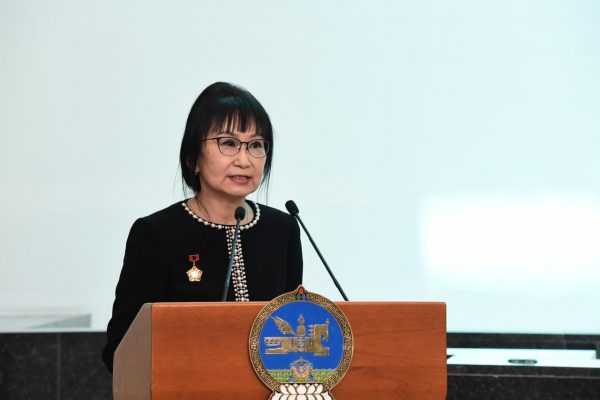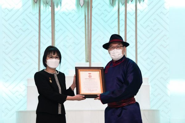 Б.Чимидийн нэрэмжит шагнал олгох тухай Улсын Их Хурлын даргын захирамжыг уншиж сонордуулсны дараа Г.Занданшатар дарга Монгол Улсын Гавьяат хуульч Ц.Сарантуяад өргөмжлөл, шагналыг нь гардууллаа.