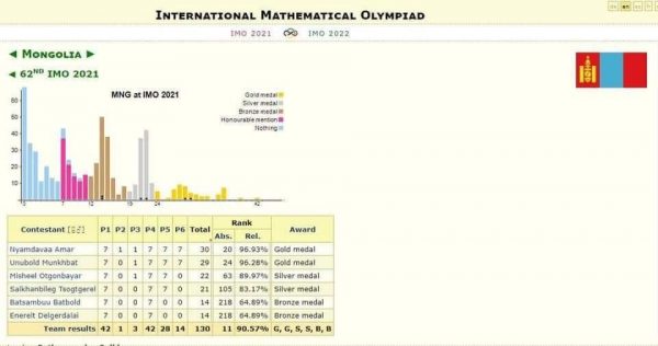Монголын сурагчид олон улсын математикийн олимпиадаас 2 алт, 2 мөнгө, 2 хүрэл медаль хүртэж багаараа 11 дүгээр байрт эрэмбэлэгджээ. Герман, Сингапур зэрэг орныг ардаа орхиж бахархам амжилт гаргасан сурагчид, багш нар, тэдний эцэг эх, асран хамгаалагчдад халуун баяр хүргэж талархал илэрхийлье.