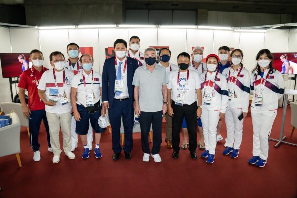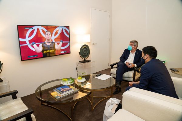 ОУОХ-ны Ерөнхийлөгч Томас Бах, МҮОХ-ны Тэргүүн дэд ерөнхийлөгч, ОУОХ-ны Гишүүн Б.Баттүшиг нар Монголын хүндийн өргөлтийн тамирчин М.Анхцэцэгийн тэмцээнийг үзэж, хамтдаа дэмжлээ.