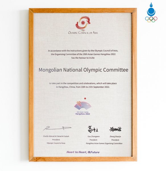 “Ханжоу-2022” Азийн наадмыг зохион байгуулах хорооноос тус наадамд оролцох албан ёсны урилгыг тухайн наадмын маскотын хамт МҮОХ-нд ирүүллээ. Ингэснээр Монголын баг тамирчид ирэх оны Азийн наадамд оролцох эрх албан ёсоор үүсэж байна.