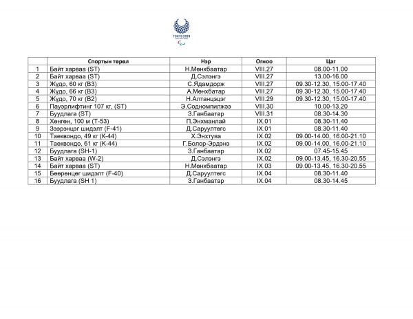 Ингээд Монголын баг тамирчдын хуваарийг танилцуулъя.
