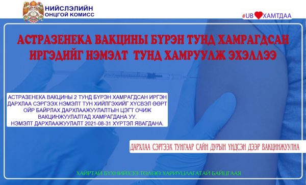Эрүүл мэндийн сайдын тушаалаар хариу арга хэмжээний буюу онцгой, цагдаа, эрүүл мэндийн байгууллагын ажилтнуудад “АстраЗенека” вакцины гурав дахь тунг хийж эхэлсэн. Тэгвэл өчигдрөөс “АстраЗенека” вакцины хоёр тунд бүрэн хамрагдсан иргэдэд гурав дахь тунг хийж эхлээд байна.
