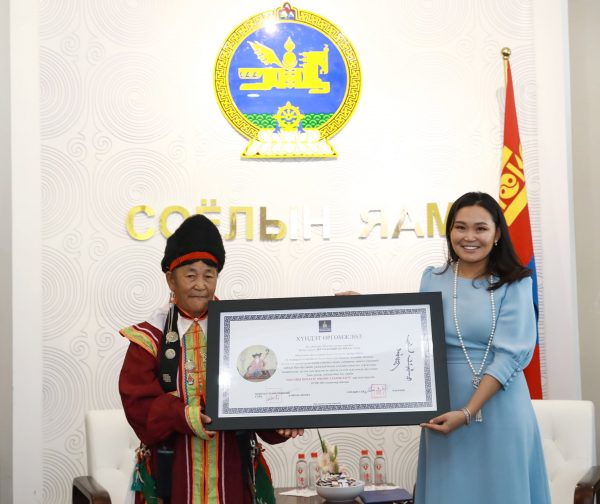Соёлын сайдын 2021 оны 02 дугаар сарын 05-ны өдрийн А/18 тоот тушаалаар Монгол Улсын соёлын биет бус өвийн шилдэг 3 дахь өвлөн уламжлагчийг тодруулан, алдаршуулж, “Хүндэт өргөмжлөл”, мөнгөн шагнал болох гучин сая төгрөгөөр шагнан урамшуулахаар шийдвэрлэсэн юм. Ковид-19 цар тахлын улмаас тодорхойгүй хугацаагаар хойшлогдоод байсан шагнал гардуулах ёслолын ажиллагааг өнөөдөр Соёлын яам дээр зохион байгуулав.