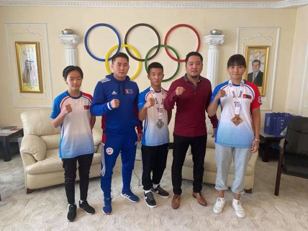 Тэгвэл медаль хүртсэн тамирчдыг дасгалжуулагч Ж.Еркиний хамт МҮОХ-ны ерөнхий нарийн бичгийн дарга, олимпын аварга Э.Бадар-Ууган хүлээн авч уулзан баяр хүргэж, хувиасаа гарын бэлэг гардууллаа.