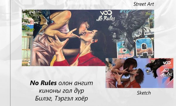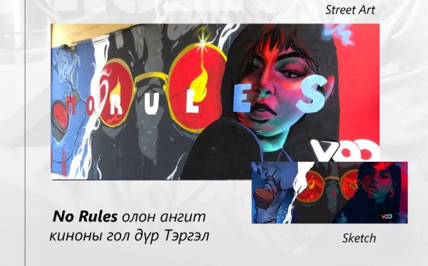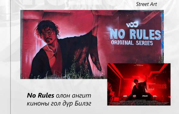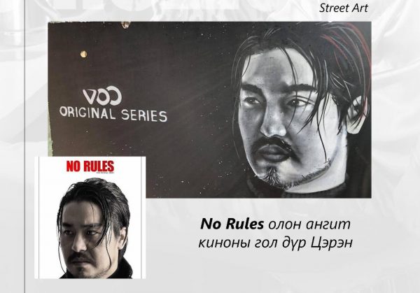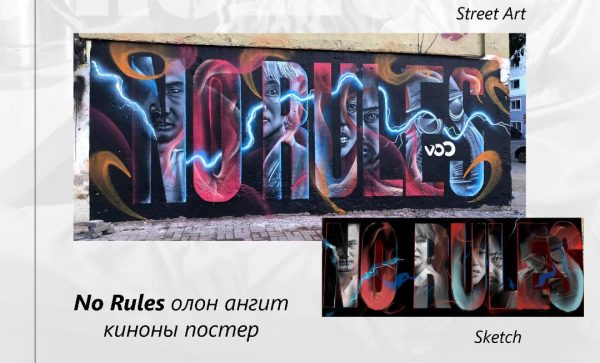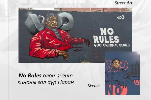 Сүүлийн үед Улаанбаатар хот маань ханан дээрх гоёмсог зургуудаар чимэглэгдэх болжээ. Oi entertainment-ийн авьяаслаг залуучуудын бүтээсэн “No Rules” олон ангит киноны дүрүүдийг зурсан гудамжны артуудыг онцолж байна. Эдгээр зургуудыг notype.crew-ийн артистууд урлажээ.