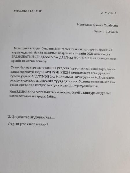 “Exclusive” компанийн захирал Г.Майцэцэг Спортын төв ордны гадаа МУГТ Э.Цэндбаатарыг ДАШТ-д оролцуулахыг шаардан гарын үсэг цуглуулж байна.