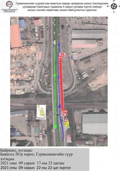 Түүнчлэн хоёрдугаар эгнээний хөдөлгөөнийг есдүгээр сарын 24-ний 23:00 цагаас есдүгээр сарын 27-ны 22:00 цагийн хооронд хааж, засварын ажил хийж, хөдөлгөөн зохион байгуулалтад өөрчлөлт орно.