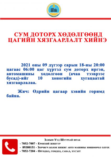 Дорноговь аймгийн Замын-Үүд суманд 10 хоногийн хугацаанд оройн 20:00 цагаас өглөөний 06:00 цагийн хооронд явган зорчигч болон авто машины хөдөлгөөнийг хязгаарлаж эхэлжээ.