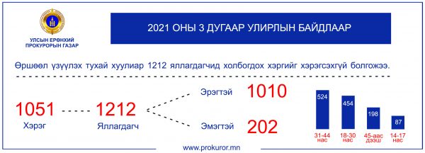 Прокурорын байгууллага 2021 оны 3 дугаар улирлын байдлаар гэмт хэргийн талаарх 50651 гомдол, мэдээлэлд хяналт тавьж ажилласнаас 48.4 хувьд нь хэрэг бүртгэлтийн хэрэг нээхээс татгалзаж, 31.1 хувьд нь хэрэг бүртгэлтийн хэрэг нээн, 11.2 хувьд нь эрүүгийн хэрэг үүсгэн яллагдагчаар татаж шалгасан байна.