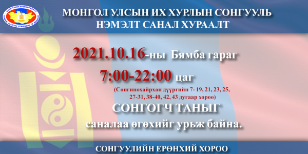 УИХ-ын 28 дугаар тойргийн нөхөн сонгуулийн нэмэлт санал хураалтад Сонгинохайрхан дүүргийн 7-19, 21, 23, 25, 27-31, 38-40, 42, 43 дугаар хорооны сонгогчид саналаа өгнө. Санал авах байрын байршлыг https://www.arcgis.com/apps/webappviewer/index.html… холбоосоор үзэх боломжтой.