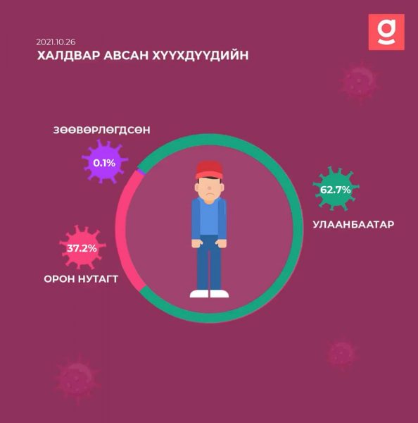 Халдвар авсан нийт хүүхдийн 62.7 хувь нь Улаанбаатар хотод, 37.2 хувь нь хөдөө орон нутагт бүртгэгдсэн бол 0.1 хувь нь гадаадаас зөөвөрлөгдсөн тохиолдол байна. Насны бүлгээр нь ялгаж үзвэл