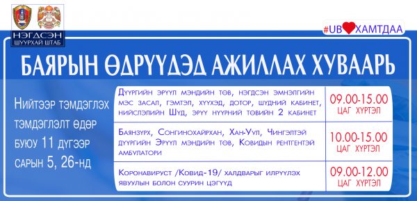 Мөн Баянзүрх, Сонгинохайрхан, Хан-Уул, Чингэлтэй дүүргийн Эрүүл мэндийн төв, Ковидын рентгентэй амбулаторийг 10:00-15:00 цаг хүртэл ажиллуулахаар зохицуулалт хийжээ.