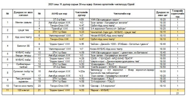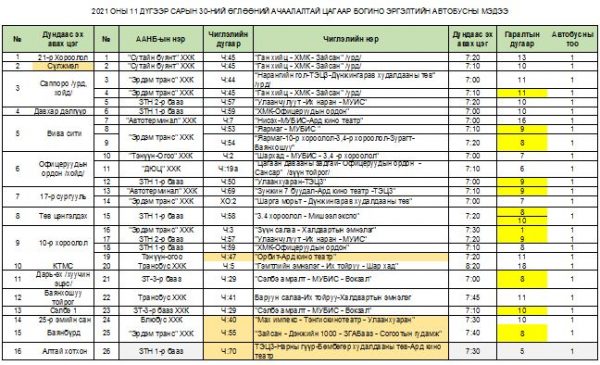 Нийтийн тээврийн үйлчилгээний газраас уртасгасан цагийн автобус үйлчилгээнд явуулаад багагүй хугацаа өнгөрч байна. Мөн ачаалал ихтэй замуудад түгжрэл үүсдэг оргил цагуудаар богино эргэлтийн автобусны үйлчилгээг нэвтрүүлжээ.