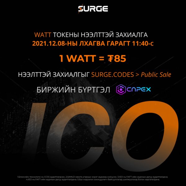 Surge WATT токены олон нийтийн нээлттэй захиалга буюу ICO-ийн захиалгыг 12-р сарын 8-ны лхагва гарагийн 11:40-ээс эхлэн ЭНЭ (https://surge.westmongolenergy.mn/register) хуудсаар дамжуулан авна. WATT токены хуваарилалт болон токен эдийн засагтай холбоотой дэлгэрэнгүй мэдээллийг ЭНД ДАРЖ (https://t.me/SURGEMongolia ) аваарай.