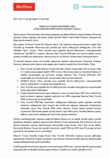 Рио Тинто”, “Туркойс Хилл Ресурсэс” компаниудаас 2021 оны арванхоёрдугаар сарын 13-ны өдөр Ерөнхий сайд Л.Оюун-Эрдэнэд хаяглан албан захидал ирүүлж, Засгийн газрын Ажлын хэсгээс гаргасан санал, шаардлагыг хүлээн авч, “Оюу толгой” ХХК дахь төрийн эзэмшлийн 34 хувьд ногдох өнөөдрийн байдлаар 2.3 тэрбум ам.долларын өрийг бүрэн тэглэх, гүний уурхайн ашиглалтад орох хүртэлх шаардлагатай нэмэлт зардлыг гадаадын хөрөнгө оруулагч тал бүрэн хариуцаж, “Эрдэнэс оюу толгой” ХХК дээр нэмж өр үүсэхгүй байхыг баталгаажуулжээ.