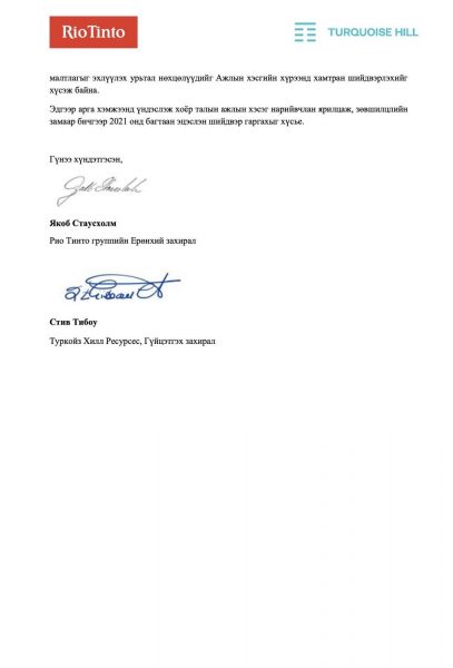 Түүнчлэн, 2015 онд байгуулсан Оюу толгой төслийн Далд уурхайн бүтээн байгуулалт, санхүүжилтийн төлөвлөгөө, Далд уурхайн бүтээн байгуулалт, санхүүжилтийн нэмэлт төлөвлөгөөг цуцлахад бэлэн буйгаа илэрхийлжээ.