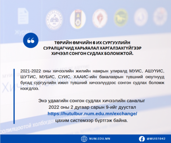 Энэ хаврын улирлаас бакалаврын түвшний оюутнууд бусад сургуулийн ижил түвшний хичээлүүдээс сонгон судлах боломж нээгдэж байна. Энэ удаагийн сонгон судлах хичээлийн саналыг 2022 оны 2 дугаар сарын 9-ийг дуустал https://hutulbur.num.edu.mn/exchange/ цахим системээр бүртгэж байна.
