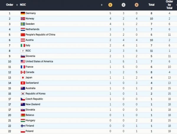 Германчууд өчигдөр хоёр алт авснаар нийлбэр дүнгээр тэргүүлж эхэлсэн бол Норвеги алт, мөнгөн медаль хүртсэн амжилтаар тавдугаар байраас хоёр руу дэвшив.