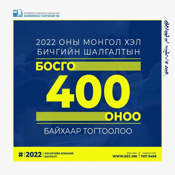 Боловсрол, шинжлэх ухааны сайдын 2022 оны 03 дугаар сарын 01-ний өдрийн А/72 дугаар тушаалаар эх хэлний боловсролын чанар, хэрэглээ, эх хэлний дархлааны түвшинг тогтоох зорилготой “Монгол хэл бичгийн шалгалт”-ын босго оноог 400 байхаар тогтоолоо.