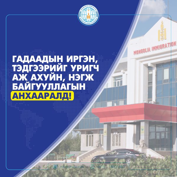 Цаашид манай байгууллагаас үйлчилгээ авахын тулд бусдаар дамжуулж, зуучлуулахгүйгээр шууд хандах, мөн мэдээллийн лавлах 1800-1882, 5 орны хэлний сонголт бүхий immigration.gov.mn цахим хуудаснаас зөвлөгөө, мэдээлэл авахыг хүсье.
