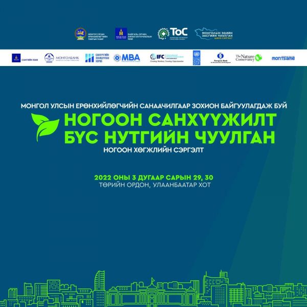 Монгол Улсын Ерөнхийлөгчийн ивээл дор 2022 оны 03 дугаар сарын 29-30-ны өдөр Төрийн ордонд “Ногоон санхүүжилт-Бүс нутгийн чуулган”-ыг зохион байгуулах гэж байна.