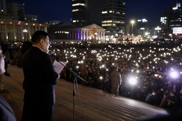 Тэрбээр “Монгол Улсын Үндсэн хуулийн 16 дугаар зүйлийн 16-д заасны дагуу үзэл бодлоо чөлөөтэй илэрхийлэх, үг хэлэх, тайван жагсаал, цуглаан хийх эрхээ эдэлж буй ардчилсан Монгол Улсын эрхэм иргэд, оюутан залуучууд аа.