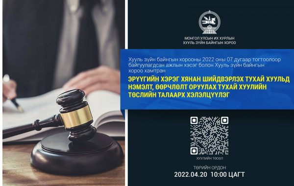 Хууль зүйн байнгын хорооны 2022 оны 07 дугаар тогтоолоор байгуулагдсан ажлын хэсэг болон Хууль зүйн байнгын хороо хамтран Эрүүгийн хэрэг хянан шийдвэрлэх тухай хуульд нэмэлт, өөрчлөлт оруулах тухай хуулийн төслийн талаарх хэлэлцүүлгийг 2022 оны 04 дүгээр сарын 20-ны өдрийн 10.00 цагт Төрийн ордонд зохион байгуулна.