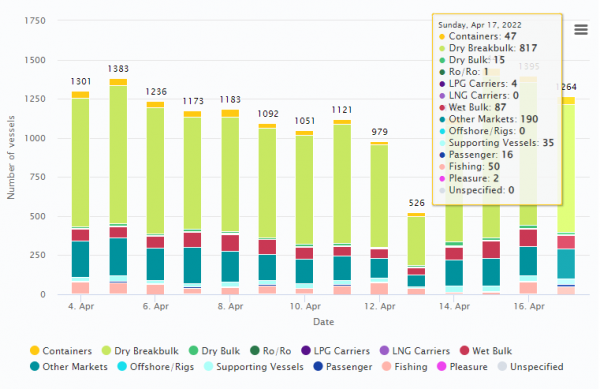 Зураг 2-т сүүлийн 14 хоногийн хугацаанд өдөрт 526-1383 хөлөг онгоц зогссон байна. 2022 оны дөрөвдүгээр сарын 17-ны өдрийн хөлөг онгоцны төрлүүдийг харвал задгай ачааны хөлөг онгоц 817, чингэлэг тээврийн хөлөг онгоц-15, Ro/Ro-1, шингэн задгай ачааны хөлөг онгоц 87, загас агнуур 50, LPG танкер хөлөг онгоц 4, туслах хөлөг онгоц 35, зорчигч 16 бусад 190 төрлийн хөлөг онгоцнууд зогссон байна.