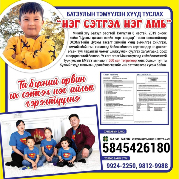 “Нэг сэтгэл- нэг амь” хандивын аянд нэгдэж, энэхүү гэр бүлд туслахыг хүсвэл Хаан банк 5845426180 Н.Батзул гэсэн дансаар хандив өргөхийг нийт монголчууд болон гадаадад амьдарч буй монголчууд та бүхнээсээ хүсэж байна.