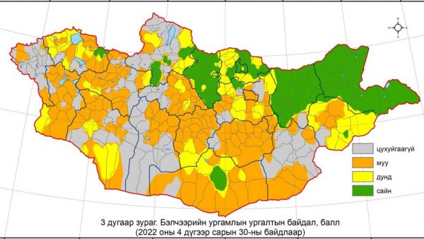 Цаг уурын байгууллагын ирүүлсэн мэдээллээр бэлчээрийн ургамлын ургалт 04 дүгээр сарын 30-ны байдлаар Хэнтий, Дорнод, Булган, Дархан-Уулын ихэнх, Хөвсгөл, Сэлэнгийн зарим, Увс, Төв, Өмнөговийн ганц нэг сумдын нутгаар хэвийн, Увс, Говь-Алтай, Хөвсгөл, Өвөрхангай, Орхон, Сэлэнгэ, Төв, Өмнөговь, Сүхбаатарын зарим, Ховд, Завхан, Архангайн ганц нэг сумдын нутгаар дунд буюу ургамал оройтож цухуйсан.