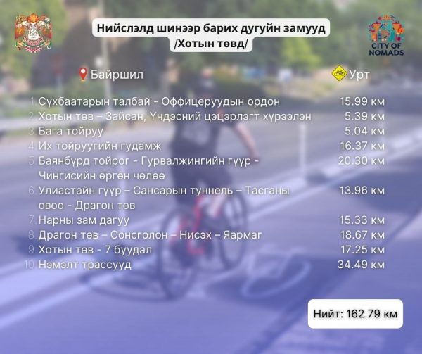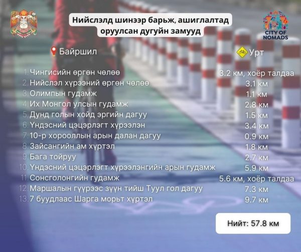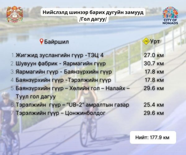 - Тэрэлжийн гүүр – Цонжинболдог /29.6 км/ зэрэг байршлуудад дугуйн зам шинээр тавих юм.