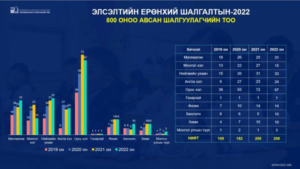 Энэ жилийн ЭЕШ-д нийт 208 шалгуулагч 800 оноо авчээ.