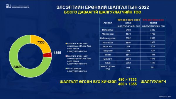 Монгол Улсын хэмжээнд их, дээд сургуульд элсэгчдийн сурах ерөнхий чадвар, мэдлэгийн түвшинг тогтоох зорилготой “Элсэлтийн ерөнхий шалгалт” 2022 оны зургаадугаар сарын 23-26-ны өдрүүдэд болж өндөрлөлөө.