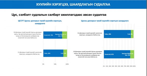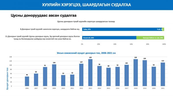 Ажлын хэсгийн зүгээс өнөөгийн хууль эрх зүйн орчин шаардлага хангаж байгаа эсэх талаар эрүүл мэндийн ажилтнууд болон цусны доноруудын дунд судалгаа явуулжээ. Судалгаанд хамрагдсан эрүүл мэндийн мэргэжилтнүүдийн 80 орчим хувь нь Цусны донорын тухай болон Эрхтэн, эд, эс шилжүүлэн суулгах эмчилгээний тухай хуулийг салгаж, бие даасан хуулиудаар зохицуулах шаардлагатай гэж хариулсан бол цусны доноруудын 97 хувь нь Донорын тухай хуулийг шинэчлэх хэрэгтэй гэж үзжээ.