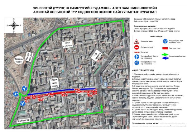 Тодруулбал, өнөө шөнө буюу долдугаар сарын 1-ний 00:00 цагаас долдугаар сарын 4-ний 05:00 цагийн хооронд Гэсэр сүмийн уулзвараас Хүнсний 1-р дэлгүүрийн уулзвар хүртэл замын хойд урсгалын хөдөлгөөнийг хязгаарлах юм.
