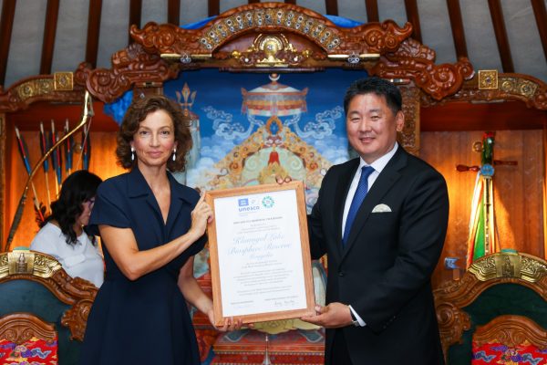 Уулзалтын үеэр ЮНЕСКО-гийн Ерөнхий захирал Одри Азулей Хөвсгөл нуурыг Дэлхийн шим мандлын сүлжээнд бүртгэсэн тухай батламжийг гардуулав.