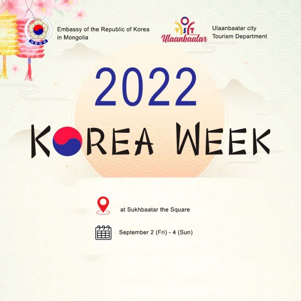 БНСУ-аас Монгол Улсад суугаа Элчин сайдын яам, Нийслэлийн Засаг даргын Тамгын газар /НЗДТГ/, Нийслэлийн Аялал жуулчлалын газартай хамтран “Солонгосын соёл, аялал жуулчлалын өдрүүд-2022”-ийг есдүгээр сарын 2-4-ний өдрүүдэд Сүхбаатарын талбайд зохион байгуулах гэж байна.