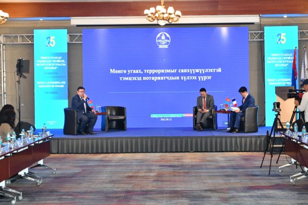 Монголын Нотариатчдын Танхим үүсэн байгуулагдсаны 25 жилийн ойд зориулан зохион байгуулсан “Мөнгө угаахаас урьдчилан сэргийлэх, Эвлэрүүлэн зуучлал ба нотариат” сэдэвт олон улсын хэлэлцүүлэгт Мөнгө угаах, терроризмыг санхүүжүүлэхтэй тэмцэх Үндэсний зөвлөлийн дарга, Хууль зүй, дотоод хэргийн сайд Х.Нямбаатар оролцож үг хэллээ.
