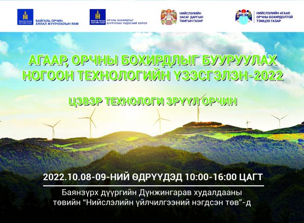 Байгаль орчин, аялал жуулчлалын яам, Орчны бохирдлыг бууруулах үндэсний хороо, Нийслэлийн Засаг даргын Тамгын газар, Нийслэлийн Агаар, орчны бохирдолтой тэмцэх газрын хамтарсан “Агаар, орчны бохирдлыг бууруулах ногоон технологи-2022” үзэсгэлэн маргааш нээлтээ хийнэ. “Цэвэр технологи-Эрүүл орчин” уриатайгаар зохион байгуулагдаж байгаа үзэсгэлэн аравдугаар сарын 8, 9-нд 10:00-16:00 цагийн хооронд Дүнжингарав худалдааны төвийн Нийслэлийн Үйлчилгээний нэгдсэн төвд дэлгэгдэх юм.